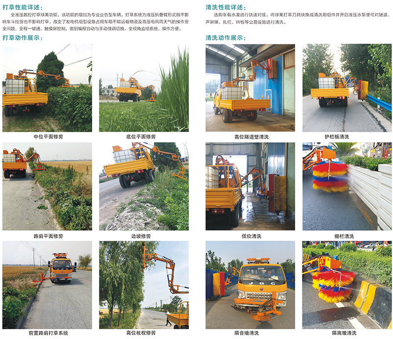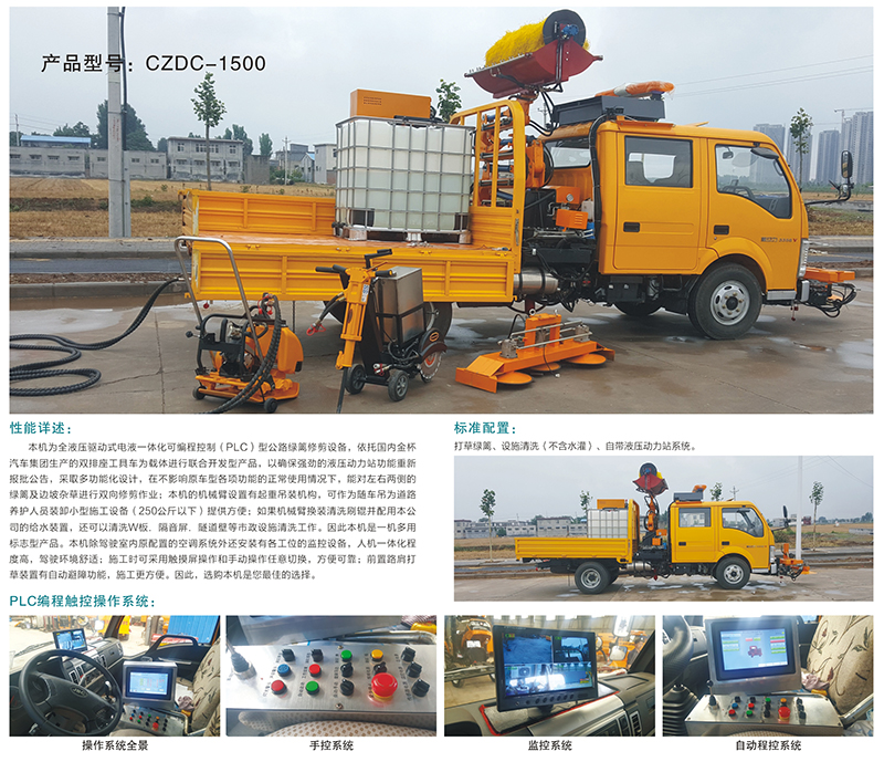 綠籬機是全液壓驅動式電液一體化可編程控制型的公路綠籬修剪設備,依托國內金杯汽車集團生產的雙排座工具車為載體進行聯合開發型產品,確保強勁的液壓動力站功能重新報批公告,采取多功能化設計,在不影響原車型各項功能的正常使用情況下,能對左右兩側的綠籬及邊坡雜草進行雙向修剪作業。