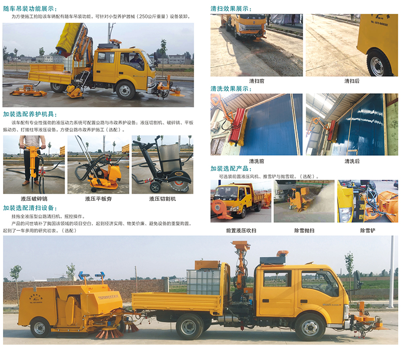 本機的機械臂設置有起重吊裝機構,可作為隨車吊為道路養護人員裝卸小型施工設備(250公斤以下)提供方便;如果機械臂換裝清洗刷輥并配用鑫奧機械生產的給水裝置,還可以清洗W板、隔音屏、隧道等市政設施清洗工作。